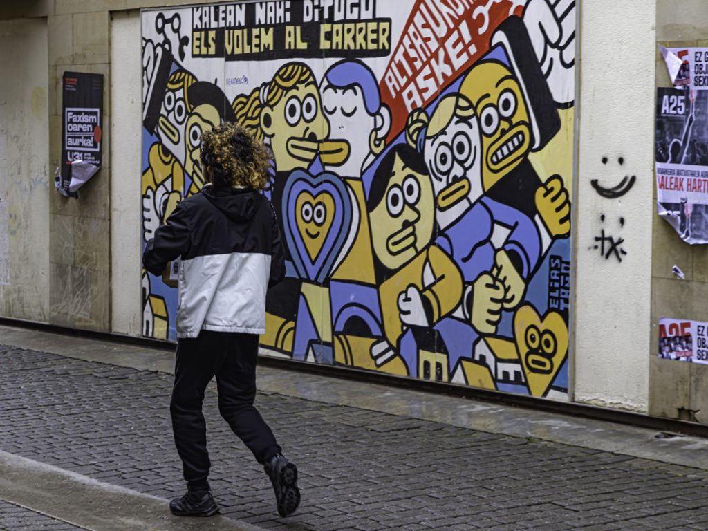 Illusion,illusion photographique: il s’agit en fait d’un livreur passant devant une fresque du graphiste Espagnol Elias Taño (43 ans ) revendiquant la libération (NOUS LES VOULONS LIBRES) de 8 jeunes basques d’Alsasua injustement condamnés en 2016 à un total de 270 ans et incarcérés suite à une altercation dans un bar de la ville avec 2 agents de la Guardia Civile en civil. Ils ont été libérés aprés un virulente action de leurs parents et de la population. Cette affaire a fait grand bruit au Pays Basque, en Catalogne ( d’où la citation en Catalan) et en Espagne ( hors Castille)